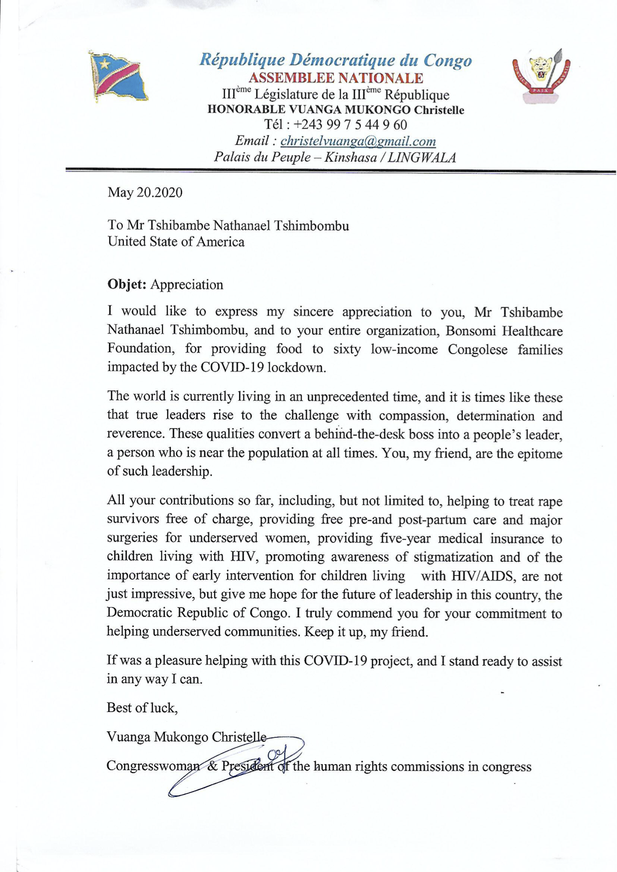 On behalf of Bonsomi Healthcare Foundation (BHF), I would like to extend my heartfelt gratitude to those who generously donated to our COVID-19 relief project designed to provide food for two weeks to low income Congolese impacted by the COVID-19 lockdown. We owe the success of this project to your charitable donations as well as your unconditional support.